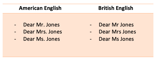 ملاحظة: من الجدير بالذكر أنّه يتمّ إضافة نقطة بعد الألقاب (Mr, Mrs, Ms...الخ) في اللغة الإنجليزية الأمريكية، في حين تُكتب هذه الألقاب دون إضافة نقطة في اللغة الإنجليزية البريطانية.